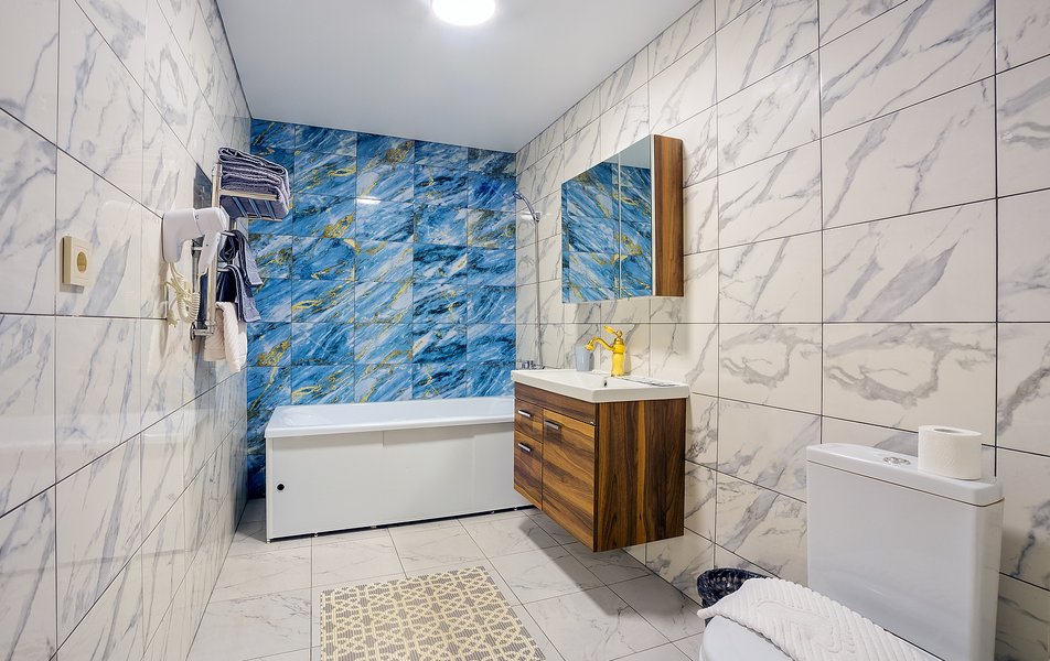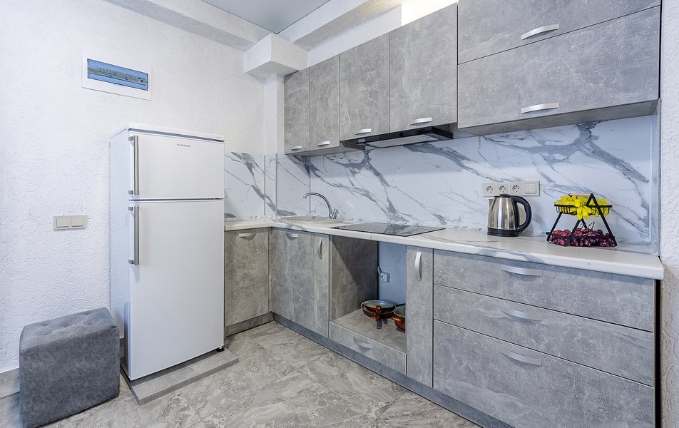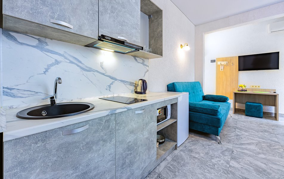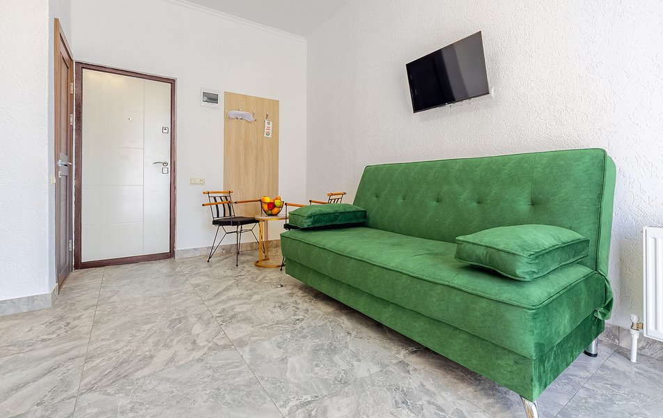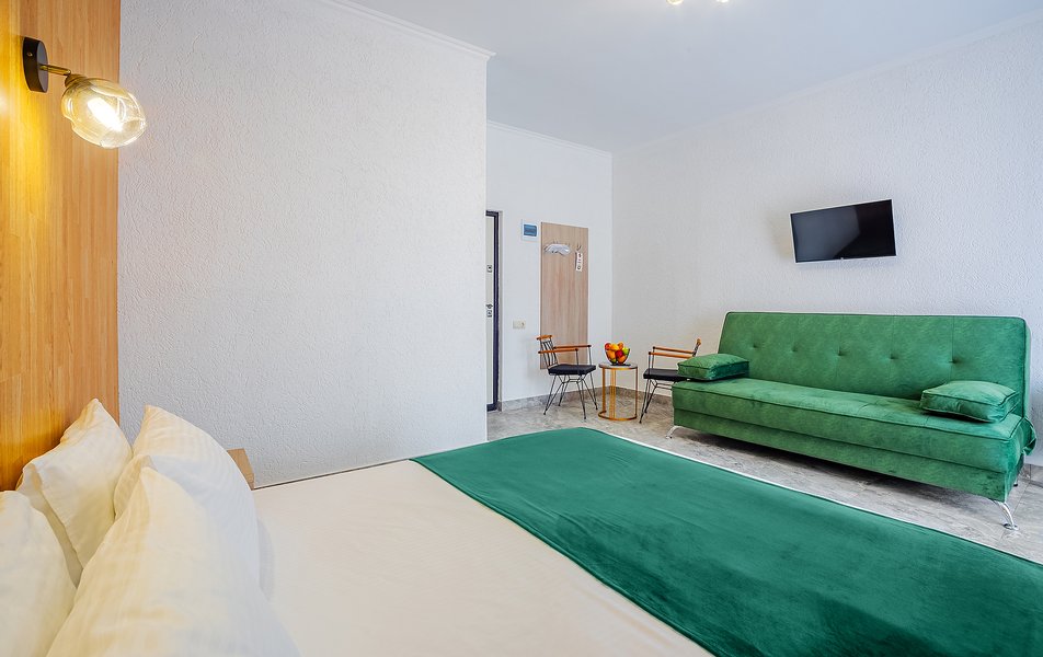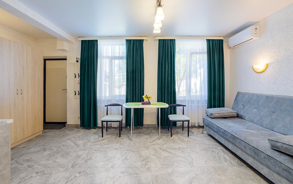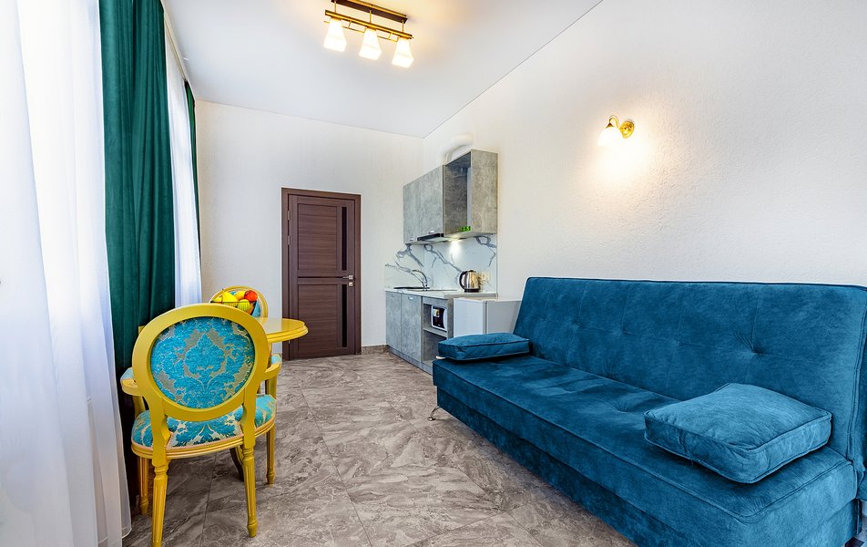 Просторные двухкомнатные апартаменты с кухней и спальней. Санузел с ванной, гигиеническим душем, тапочками, феном и набором гостиничной косметики. К услугам гостей двуспальная кровать, 2 кондиционера, телевизор, холодильник, чайник, электрическая сушилка, сейф.
