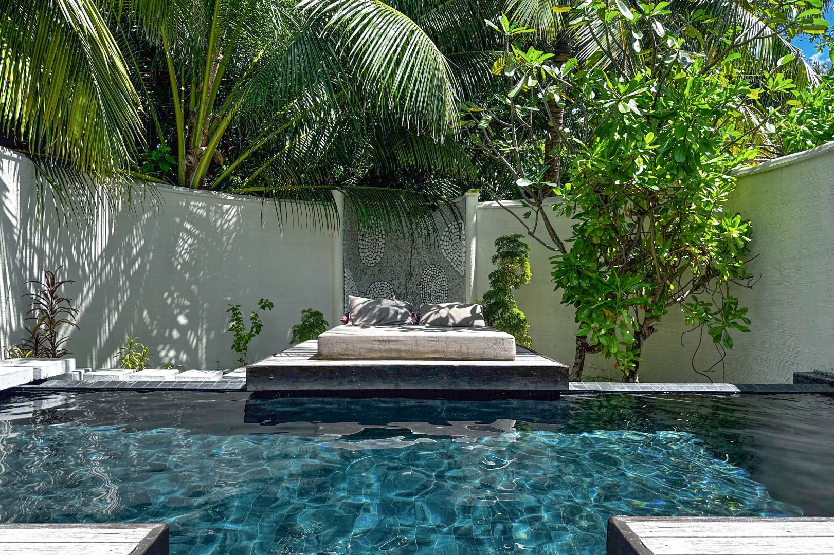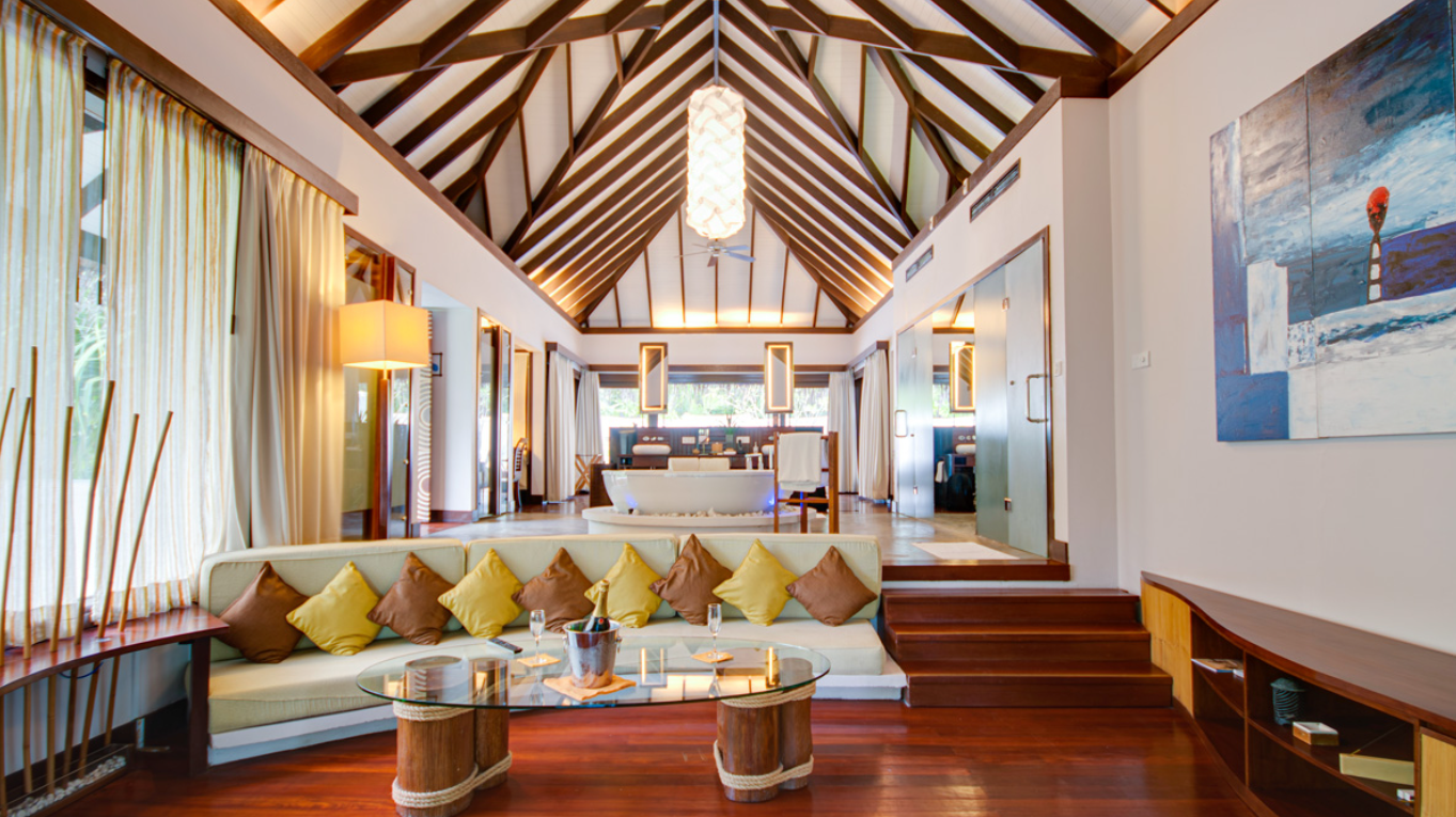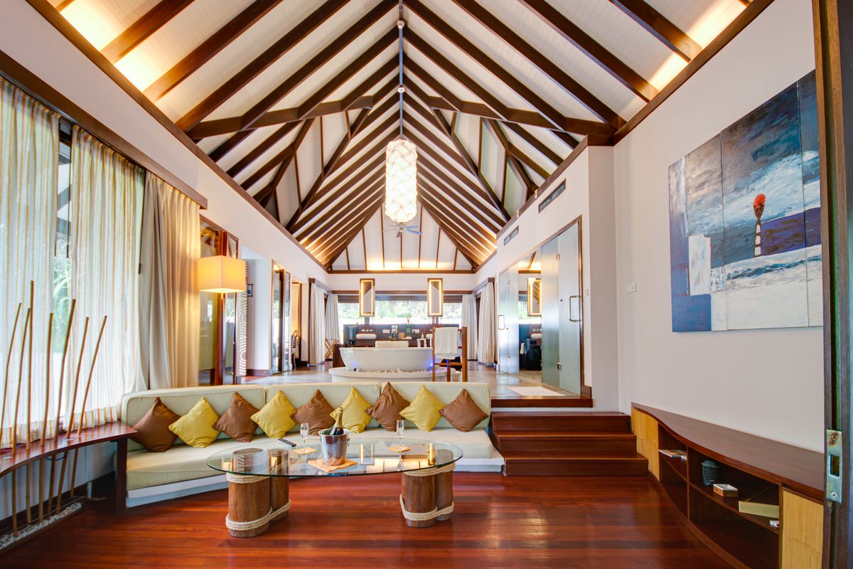 На вилле гости размещаются в спальне на двуспальной кровати размера king-size, есть терраса с шезлонгами и кушеткой, частный бассейн, прямой спуск в лагуну, душ на открытом воздухе и в помещении, санузел с ванной внутри. Среди удобств бесплатный Wi-Fi, кондиционер, телевизор, сейф, мини-бар, чайно-кофейный набор, банные принадлежности, фен.