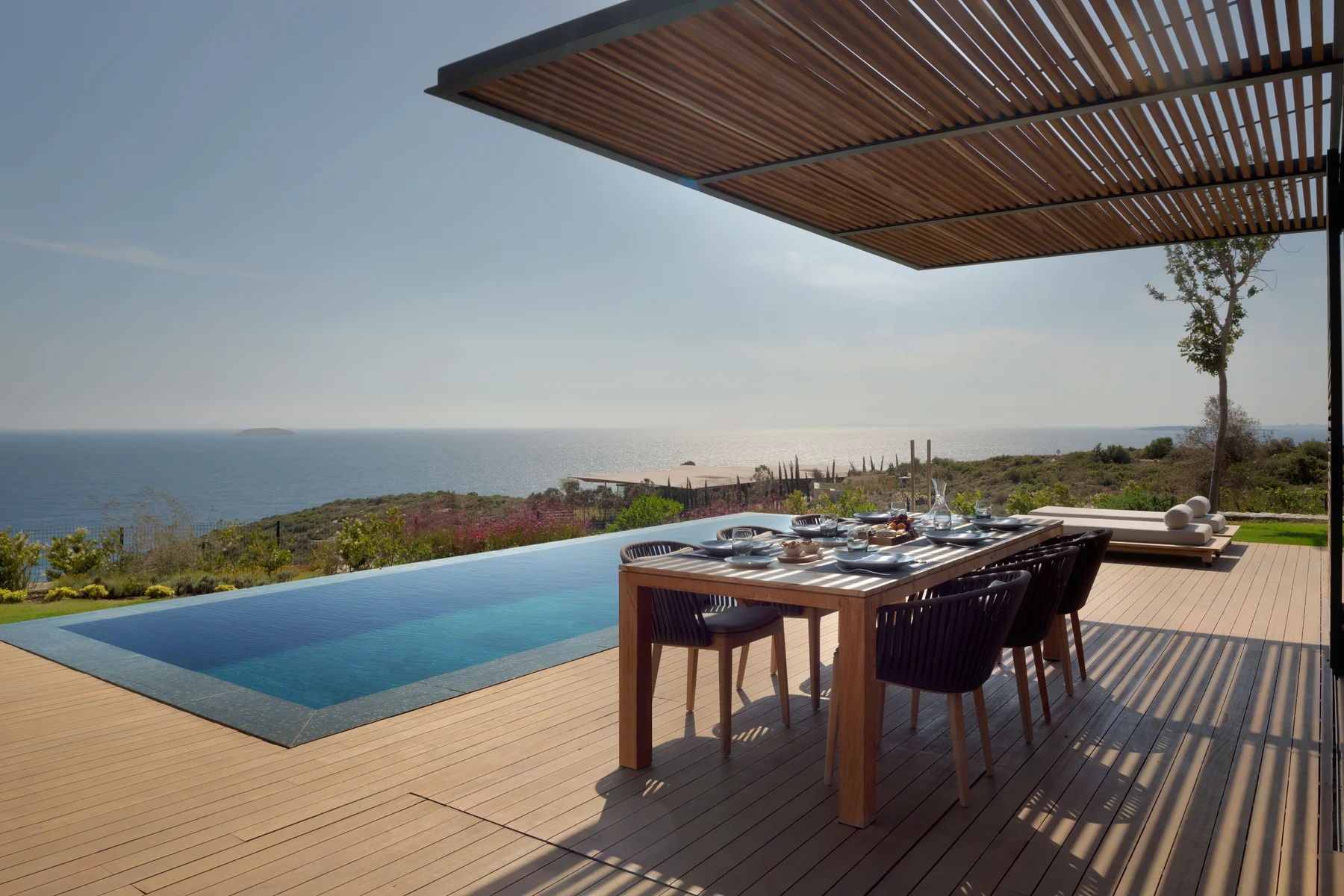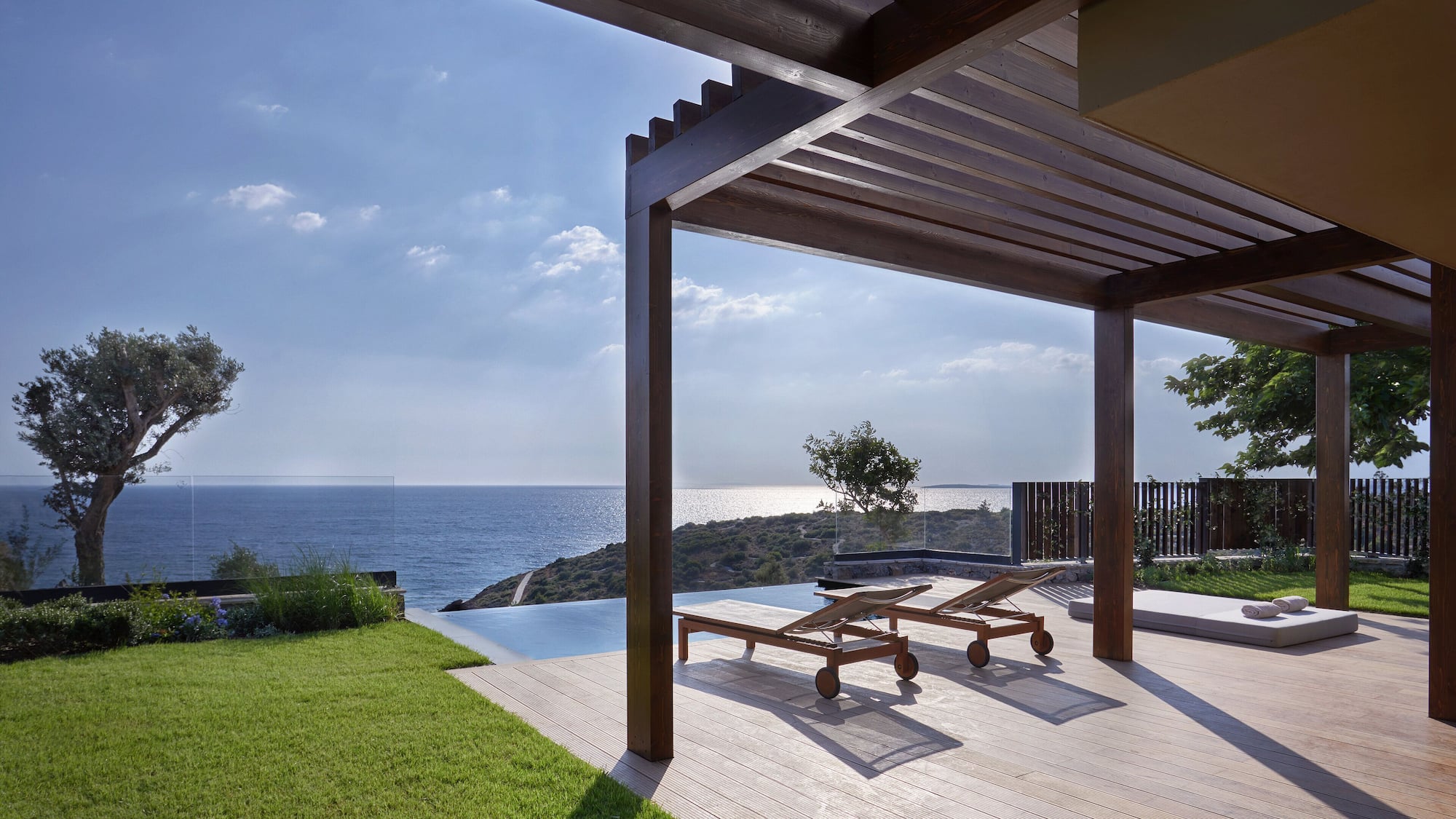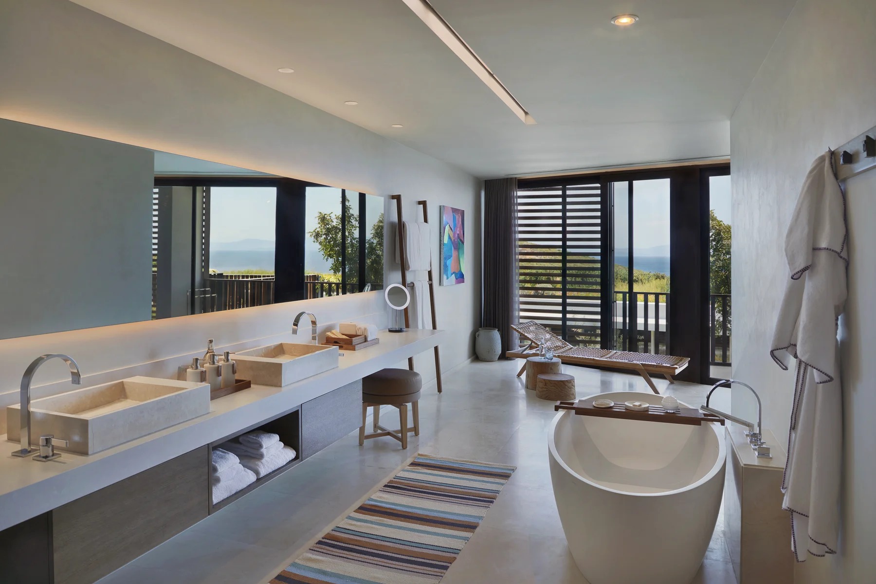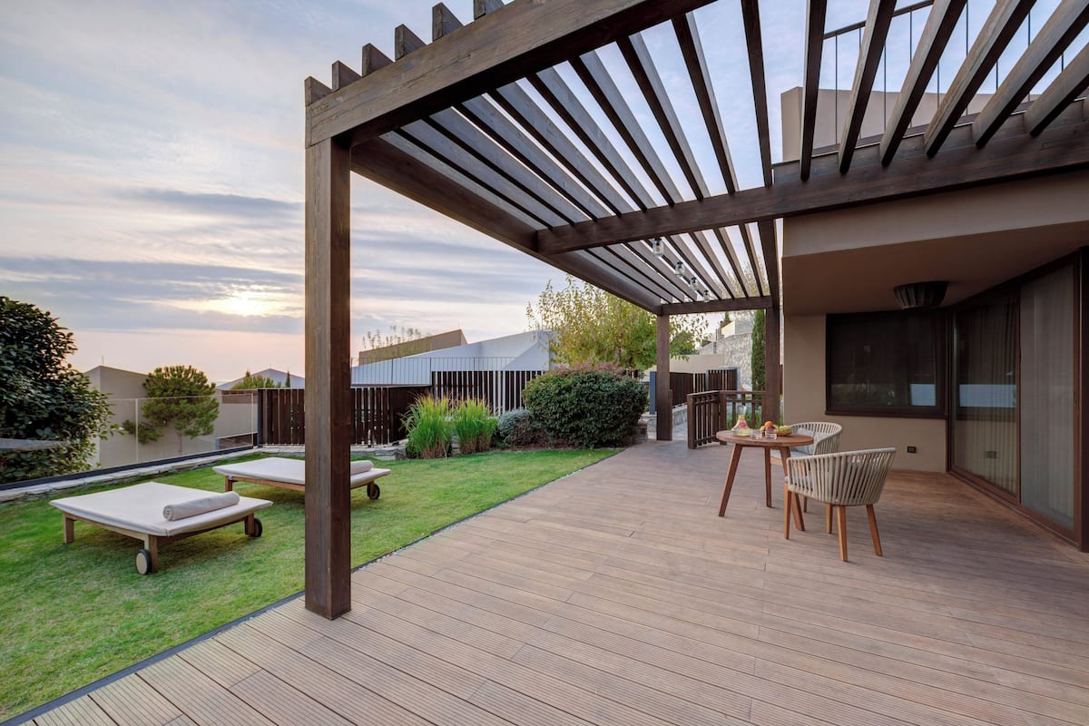 Комфортабельный номер с частным бассейном включает в себя гостиную, три спальни, три ванных комнаты с ванной/душем, гардеробную, кухню и меблированную террасу с видом на море. Из удобств телевизор, кондиционер, мини-бар, сейф, кофеварка, чайный набор, Bluetooth-динамик Marshall, фен. Предоставляется зонт, пляжная сумка и шлепанцы.