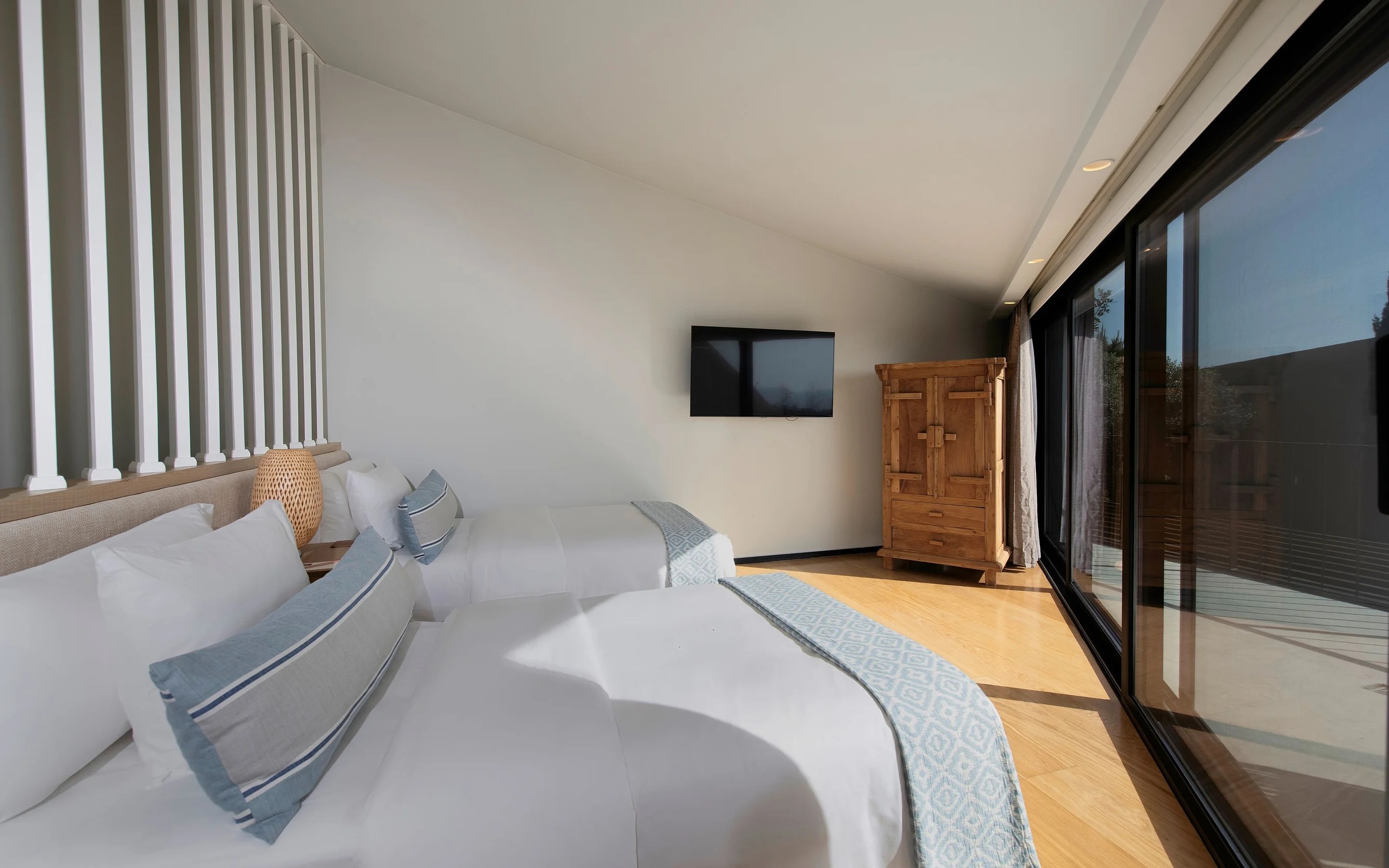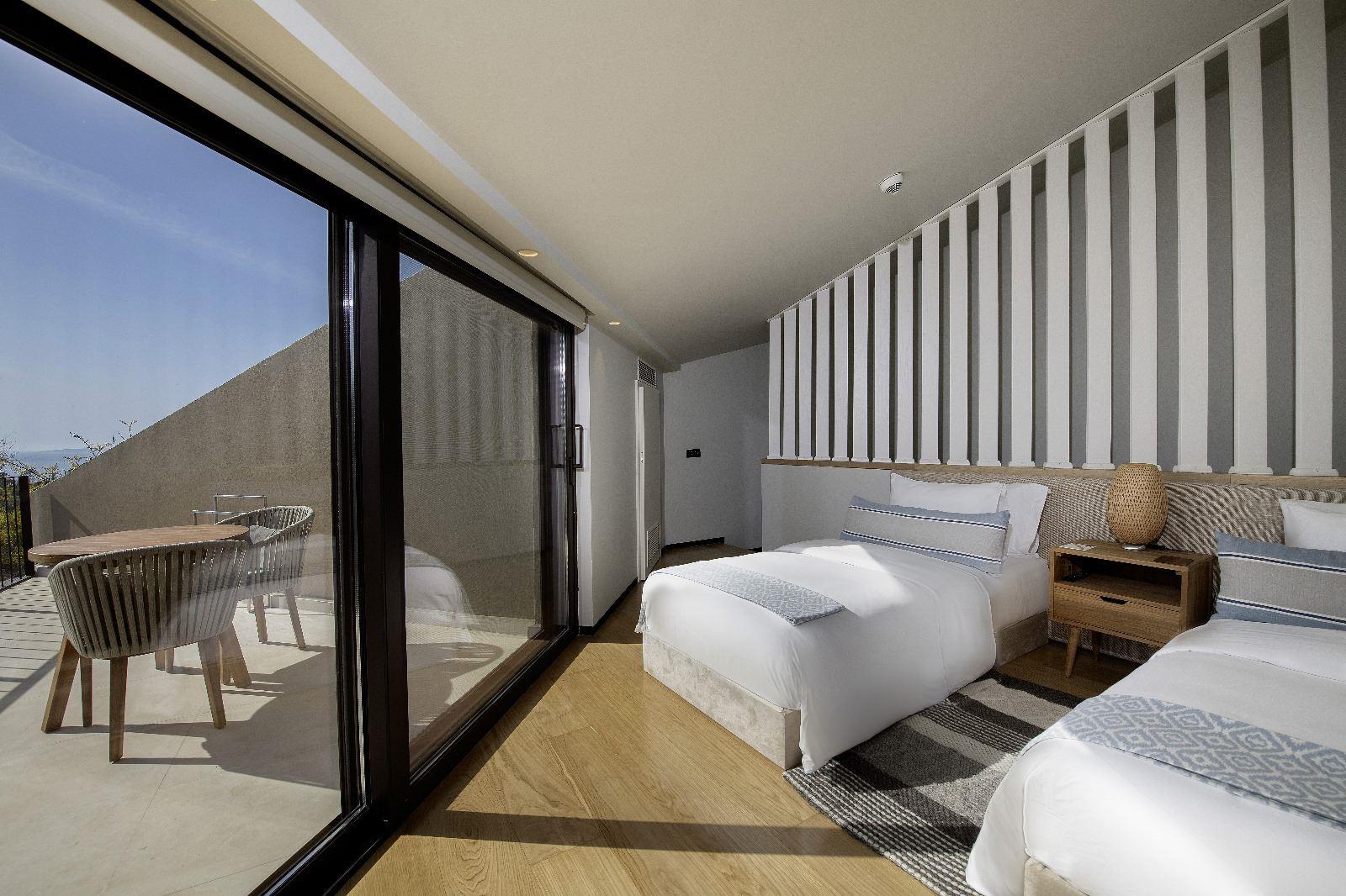 Уютный номер с одной двуспальной/двумя односпальными кроватями. В комплектации телевизор, кондиционер, мини-бар, сейф, беспроводной интернет, Bluetooth-динамик Marshall, принадлежности для чая/кофе, фен, гостиничная косметика, зонт, пляжная сумка и шлепанцы. В номере санузел с душем и ванной, гардеробная и балкон с видом на море.